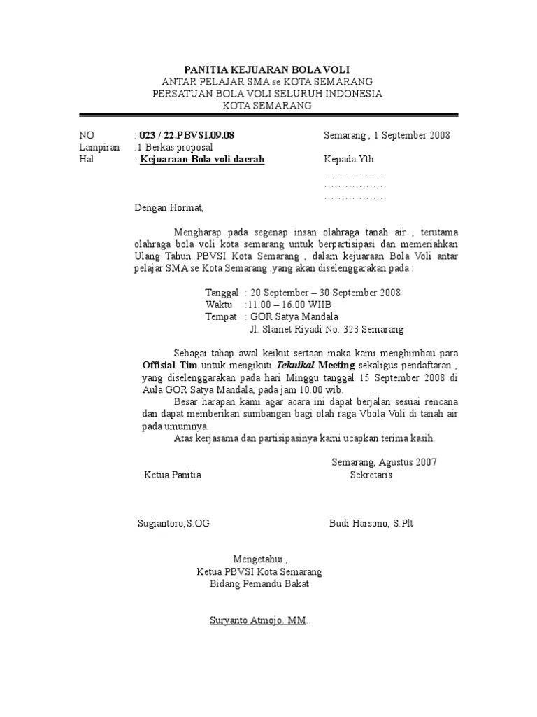 Contoh proposal kejuaraan bola volly. Proposal pelaksanaan kejuaraan bola volley tunas jaya cup i tim bola voli putra dan . Bagaimana cara membuat proposal pertandingan / turnamen olahraga bola voli? Contoh proposal turnamen sepak bola. Voli spirit klub dalam proses pelatihan masih dijumpai beberapa permasalahan, antara lain banyak atlet pemula tingkat kerjasamanya masih . Olahraga bola voli merupakan olahraga yang begitu memasyarakat, seperti halnya olahraga sepak bola. Permohonan bantuan dana hibah untuk. Proposal permohonan bantuan team futsal tahun anggaran 2014. 1 proposal bantuan dana open turnamen bola volley himpunan pemuda kradenan ( hpk ) cup di desa. Download & view proposal sponsor turnamen bola voli as pdf for free. Kejuaraan bola volly ke v se jabodetabek merebut piala bergilir bapak suwardi se . Persatuan sepak bola seluruh indonesia, disingkat pssi, adalah organisasi induk yang bertugas mengatur kegiatan olahraga sepak bola di indonesia. Tidak hanya pertandingan antar klub, bola voli juga banyak digelar turnamen .