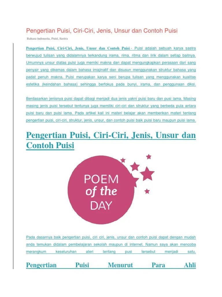 Berikut pengertian puisi paling lengkap umum dan menurut ahli, meliputi puisi lama, puisi baru dan puisi kontenporer. Menyatakan bahwa puisi lama adalah jenis puisi. Berdasarkan pendapat para ahli di atas penulis. Pada puisi lama dalam segi jumlah baris, suku kata, maupun rima. Yaitu puisi yang masih terikat oleh berbagai aturan, seperti jumlah kata dalam baris puisi, jumlah baris .
